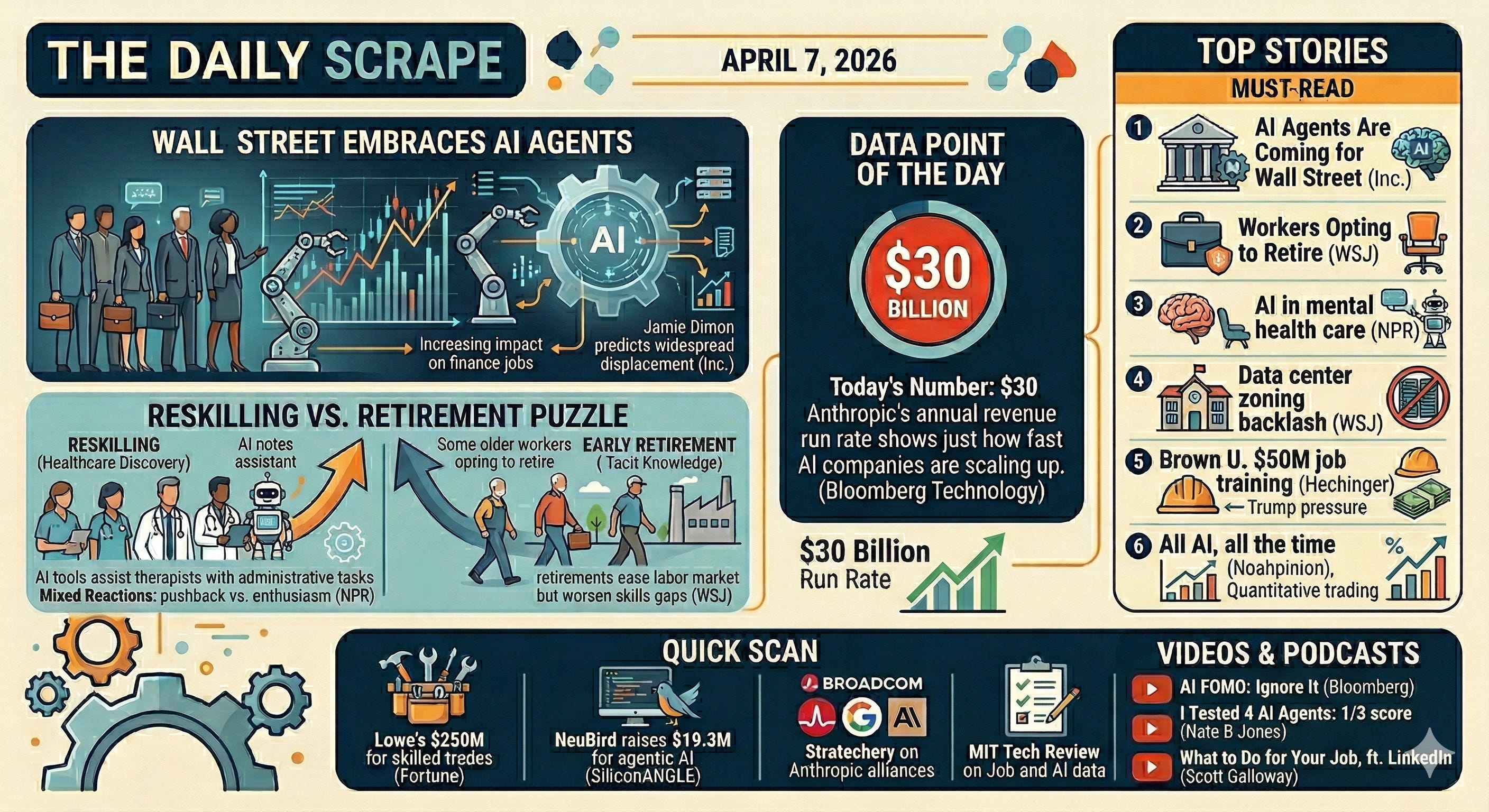 *Wall Street is embracing AI agents. While some older workers are choosing early retirement over reskilling, healthcare professionals are discovering that AI anxiety often gives way to cautious adoption once workers see the tools in action. The Trump administration has forced Brown University to invest $50 million in job training programs. *
